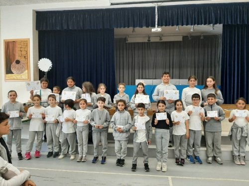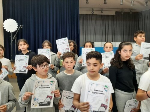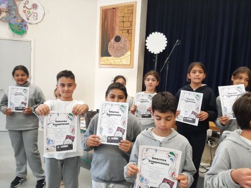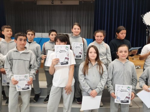 Την Πέμπτη 28 Μαρτίου, σε συγκέντρωση που πραγματοποιήθηκε στο σχολείο μας, βραβεύθηκαν τα παιδιά που συμμετείχαν στους δύο διαγωνισμούς που είχαν προκηρυχθεί, τους προηγούμενους μήνες. Τον διαγωνισμό δημιουργίας λογότυπου για το Μαθητικό μας Ραδιόφωνο και τον διαγωνισμό Φιλαναγνωσίας, με παραγωγή ποιήματος, αφίσας ή σελιδοδείχτη.